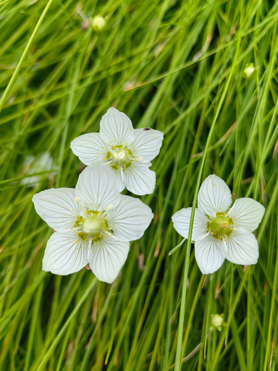 Представьте себе одиночные белые цветки, сияющие, как крошечные звёзды, на фоне сумрачного болота. Его пять белоснежных лепестков пронизаны причудливой сетью полупрозрачных жилок, отчего он кажется сотканным из хрусталя и мороза.