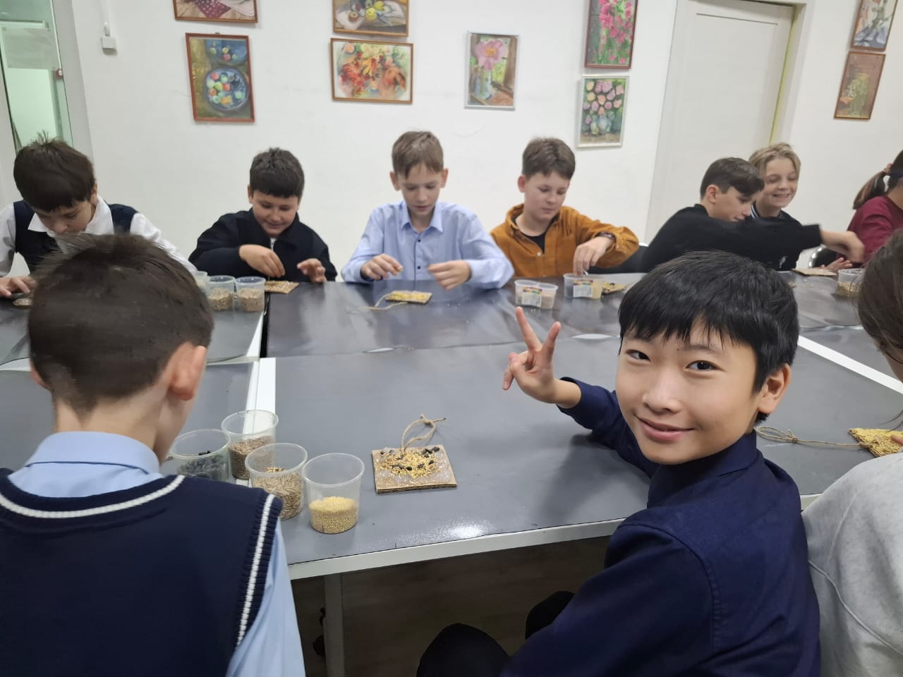 Во второй части занятия совместно с детьми была сделана экокормушка для птиц из картона, джута, кукурузного клейстера, пшена, овса и семечек – наш маленький вклад в стабилизацию экосистемы при отсутствии загрязняющего фактора как экологического, так и визуального.